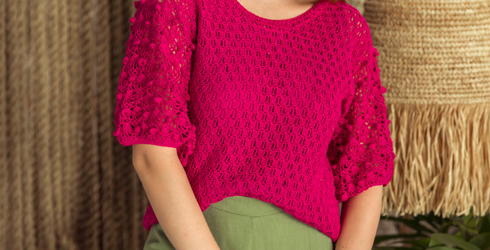 Using a tapestry needle and Cléa yarn in Pink color, join the shoulders for 3.5–4, (4, 4.5, 5), 5.5 and 6 in / 9–10, (10, 11, 13), 14 and 15 cm, leaving armhole openings of 7, (7.75, 8.5, 9), 9.5 and 10 in / 18, (20, 22, 23), 24 and 25 cm.